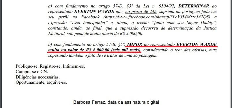 Na quinta-feira, 26 de setembro, o juiz eleitoral Dr. William G.N. Figueroa proferiu a decisão, condenando o aliado de Marinalva a pagar uma multa de R$ 6.000,00. Além disso, o juiz estipulou um prazo de 24 horas para que as ofensas fossem retiradas das redes sociais, sob pena de uma multa adicional diária de R$ 5.000,00 em caso de descumprimento.