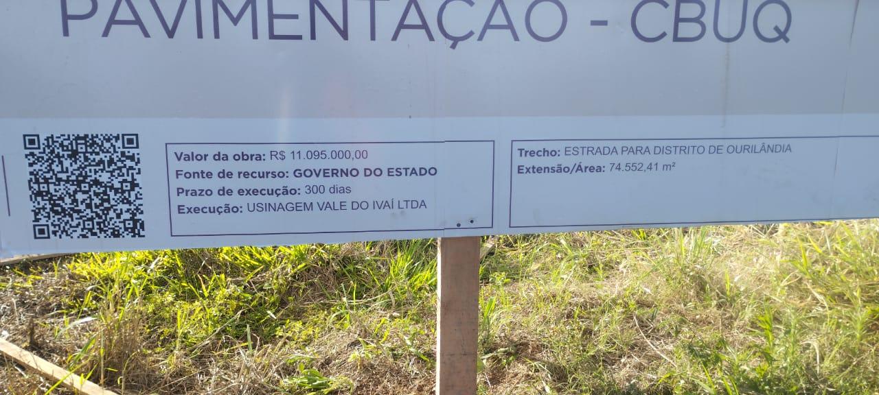 Tudo pronto para o início da pavimentação asfáltica no trecho de aproximadamente 18 quilômetros entre a cidade de Barbosa Ferraz e o distrito de Ourilândia. A placa com os detalhes da obra, incluindo valores e prazo de conclusão, já foi instalada na região do haras, local onde terão início os trabalhos.