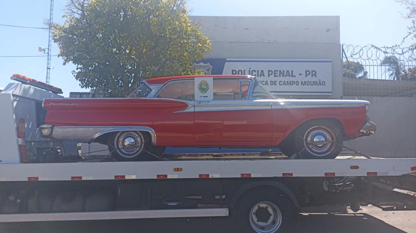 A Polícia Militar localizou um Ford 1959, vermelho, abandonado em um matagal próximo ao lago do Jardim Imperial, em Campo Mourão. Não havia registro de furto para o veículo.