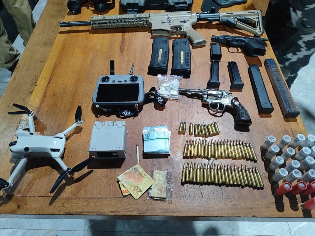 Dentro do imóvel, os policiais localizaram armas pesadas, munições, drogas, dinheiro e equipamentos de apoio. Veja o que foi apreendido: