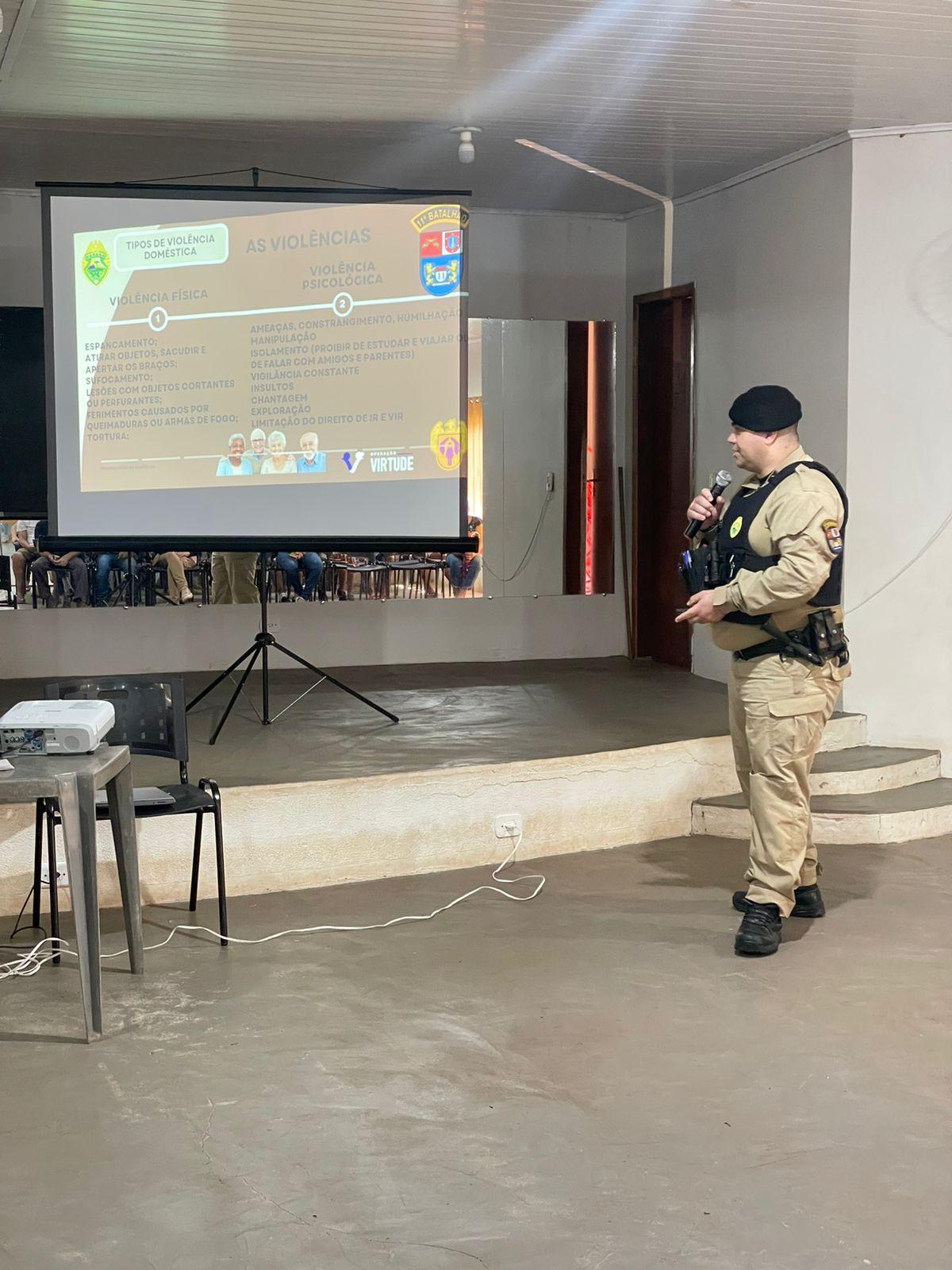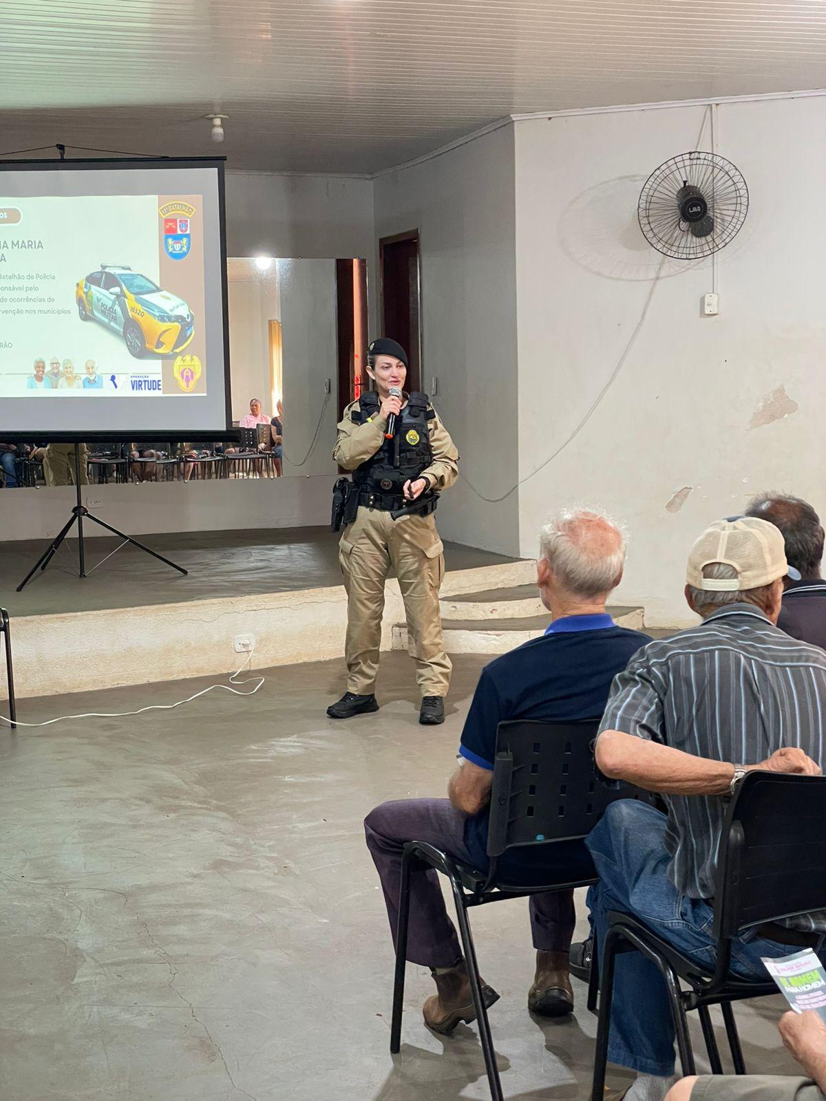 Durante o encontro foram abordados temas como direitos da pessoa idosa e formas de prevenção à violência; tipos de violência, sinais de identificação e canais de denúncia; funcionamento da rede de proteção e papel da comunidade e ações da PMPR/Patrulha Maria da Penha no apoio às vítimas e no fortalecimento de políticas públicas.