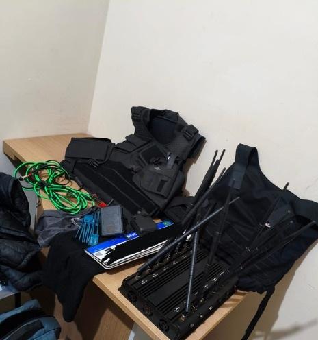 Ambos os veículos estavam com giroflex, sirene e sinais adulterados. Em continuidade, as equipes policiais localizaram um barracão com diversos ilícitos, como 4 garrafas de bebidas importadas, GPS, powerbank, jammer de 12 canais; 9 bases carregadoras e 7 rádios comunicadores Baofeng; 2 coletes balísticos e placas Mercosul adulteradas; Diversos pinos para remarcação de chassi; Munições: 2 de 9mm, 1 de .12, 1 de .380, 1 de .44 e estojo deflagrado 7,62mm.